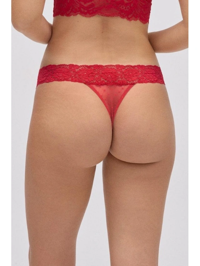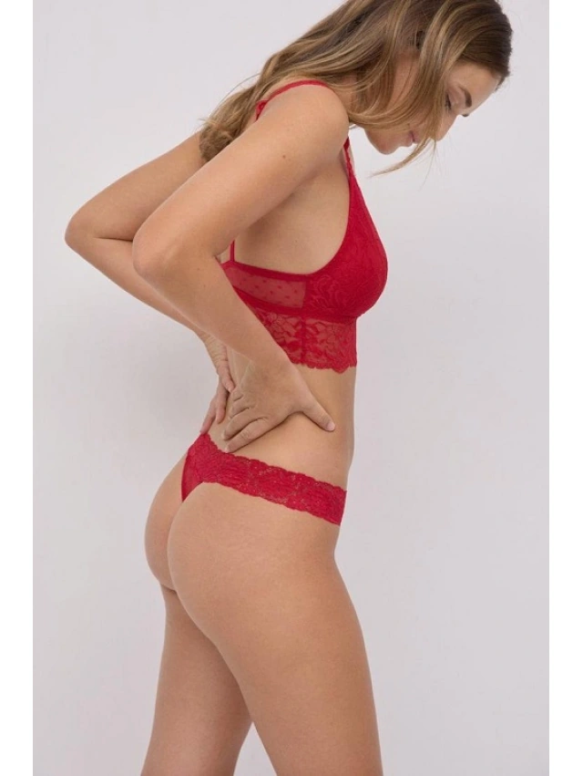 Tanga de encaje rojo. Su encaje floral semitransparente aporta un toque sofisticado. Ideal para sentirte segura, femenina.